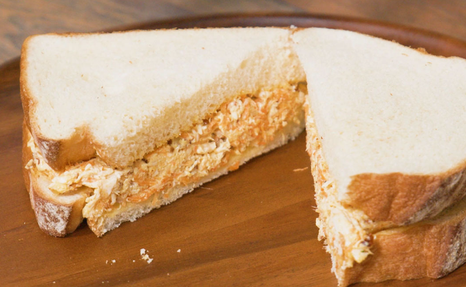 Panini de pollo, pepinillo, zanahoria y queso crema.