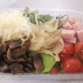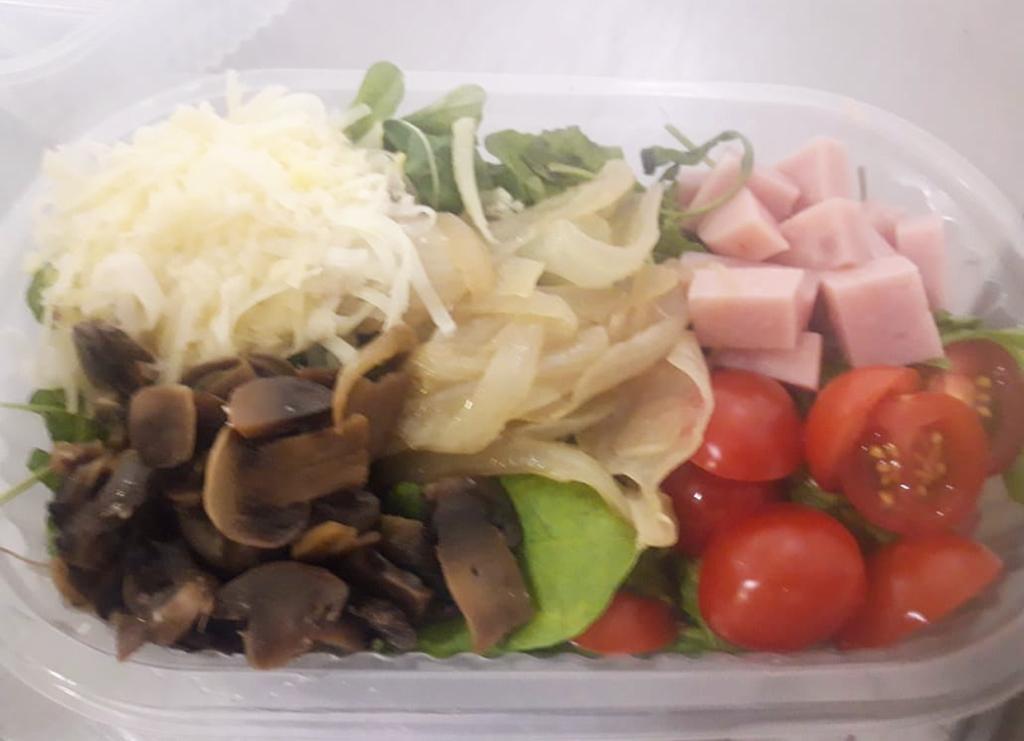 Jamon en cubos, cebolla, rucula, tomates cherry, champignones y queso rallado (Por separado)
