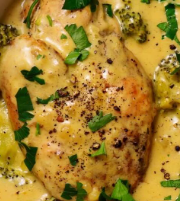 pollo con salsa honey hecha a base de miel, mostaza, vinagre, ajo en polvo y salsa de soja con guarnicion de papas cubo