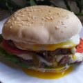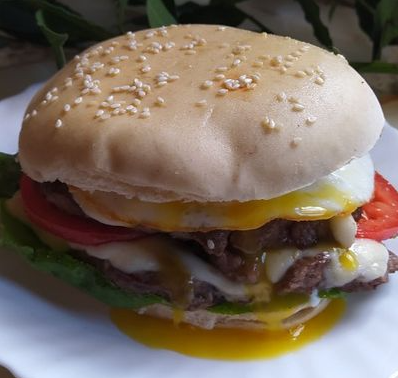 hamburguesa completa doble carne de 130gr c/u, con lechuga, huevo, jamon, tomate, queso y con fritas