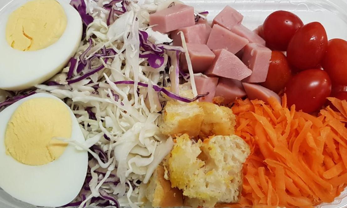 Repollo morado, repollo blanco,zanahoria, jamón, huevo, croutons y tomate.