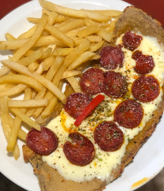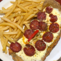Milanesa con salsa, muzza y salame milán