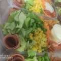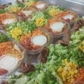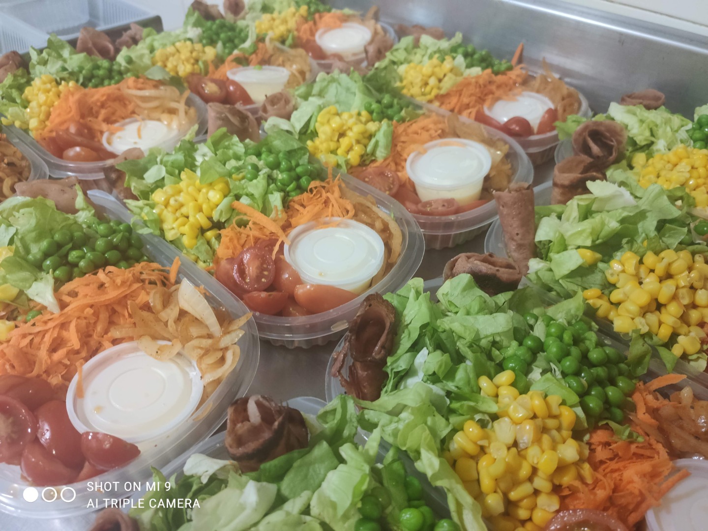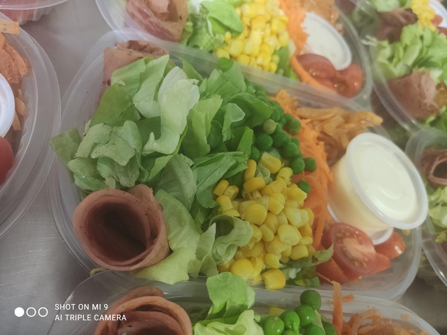 Lechugas, choclo, tomate cherry, cebolla salteada, zanahoria, arvejas panceta crocante., Adereza de mayonesa casera.