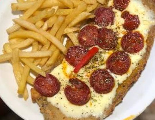 Super Milanesa de pollo con salsa-muzza y salame Calabresa