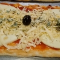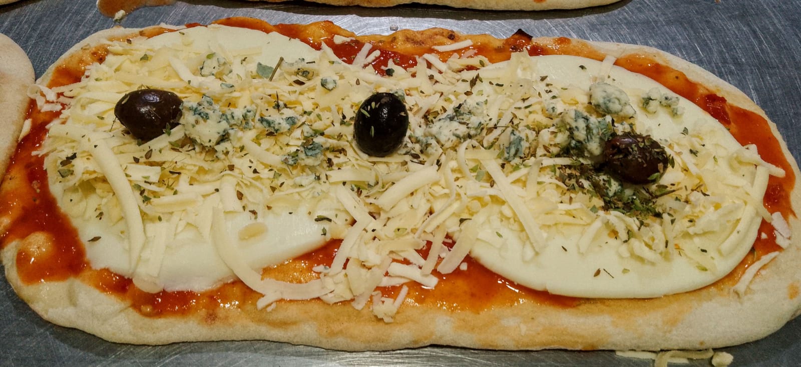 masa de pizza casera, salsa, muzza, sardo y queso azul