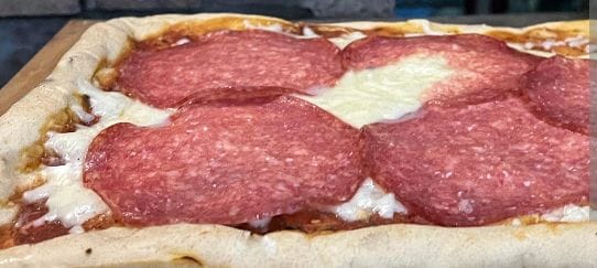 Masa de pizza casera , con salsa muzza y Rodajas de salame