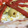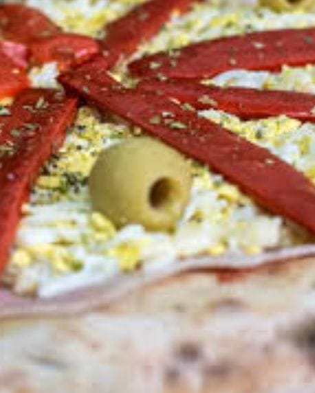 Super PIZZA de muzzarela, salsa, jamon, huevo y morron asado
